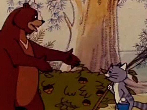 Медведь увидел, как заяц выдёргивает морковь, и решил тоже сделать запасы на зиму. Ёжик шёл мимо за грибами, и медведь присоединился к нему. Белка заготовляла лесные орехи, и медведь, бросив грибы, стал лакомиться орехами.